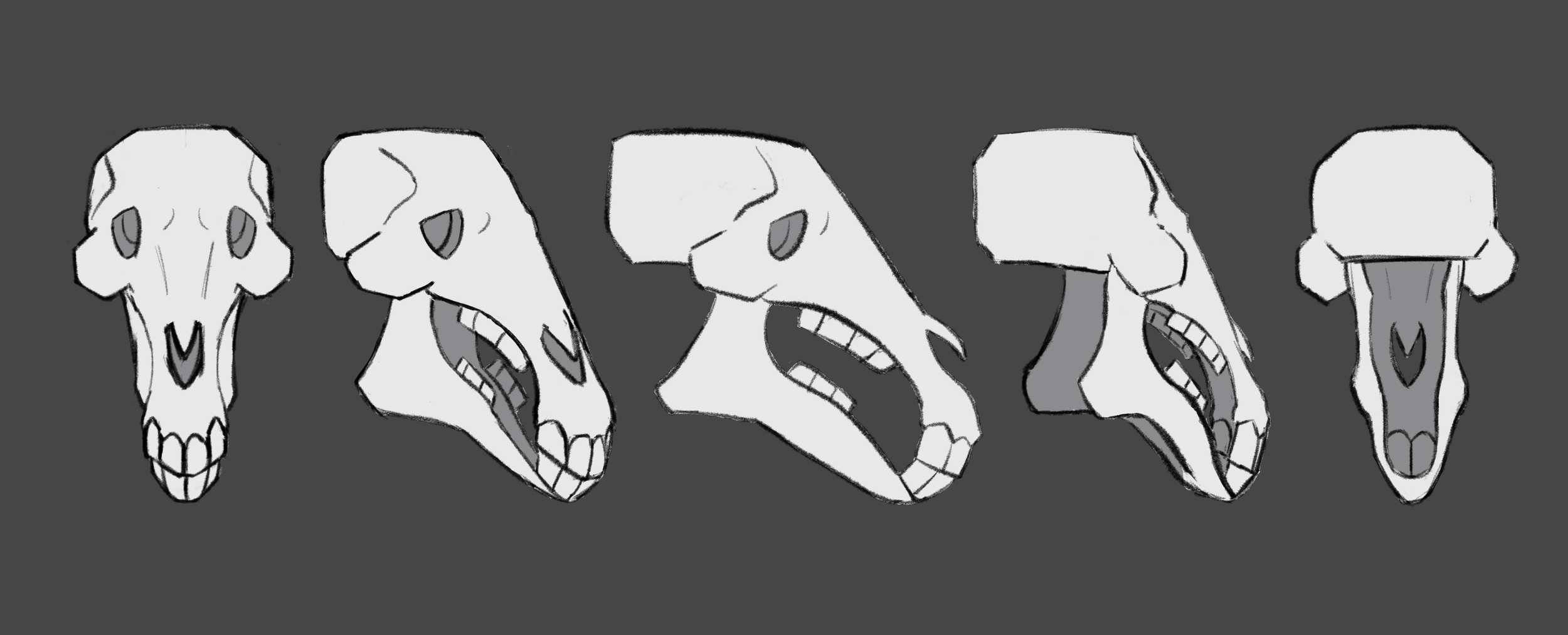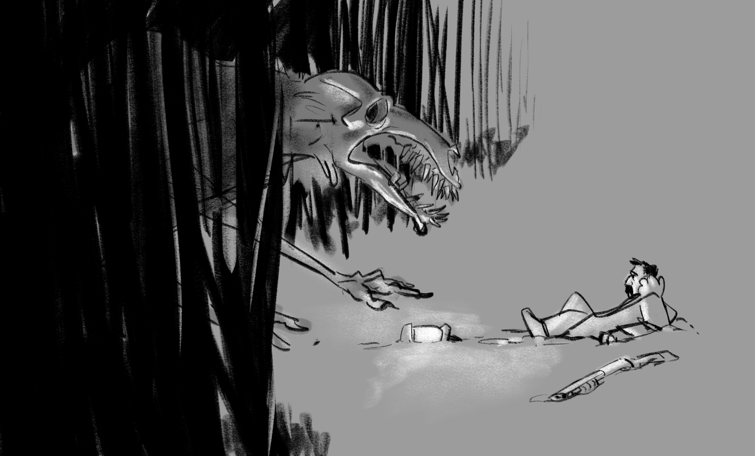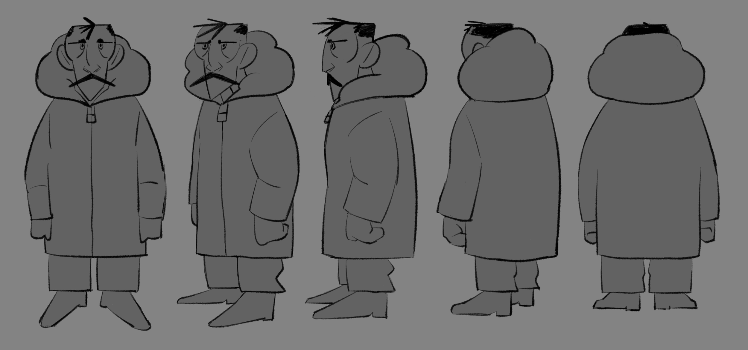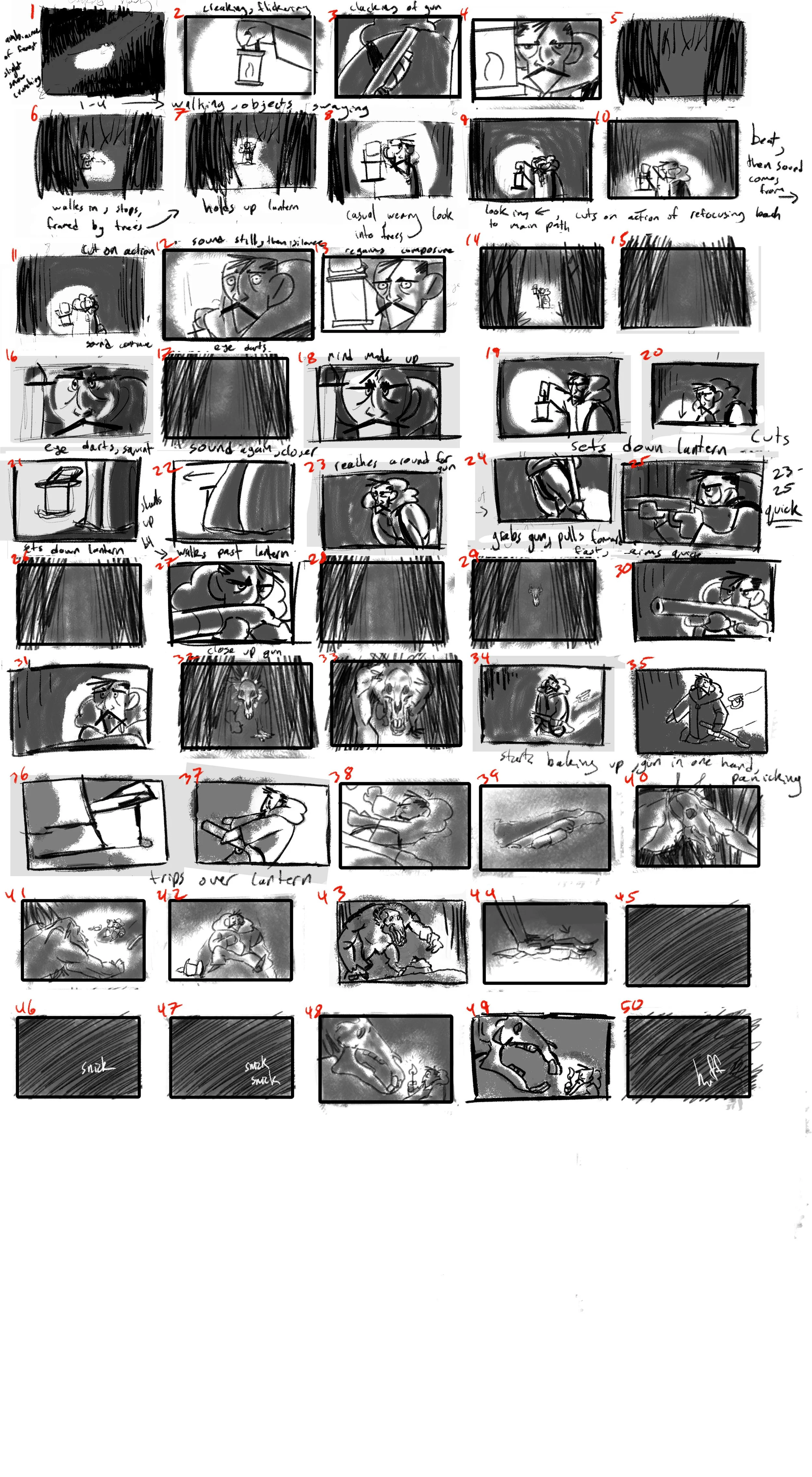 Initial designs of the Hunter and the Creature were more “realistic” and with more nuances. Final designs became more stylized, with more simple, blockier shapes and easily defined landmarks. I specifically liked the original designs of the Creature, but quickly found that it would have been too difficult for to animate, given the limited time and resources.